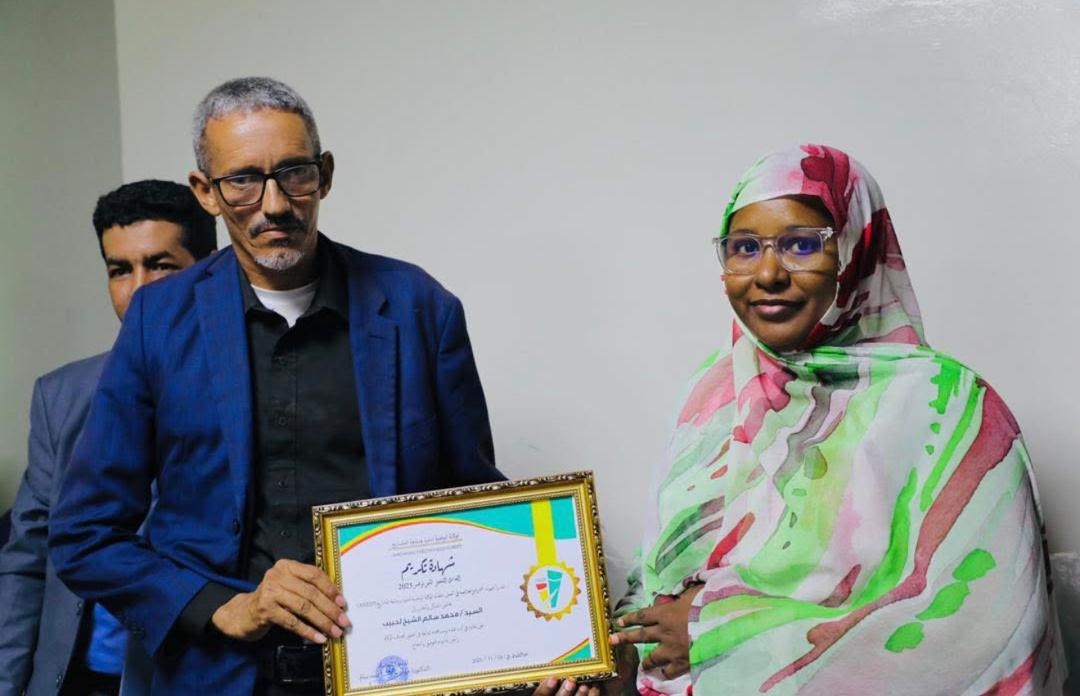 كرّمت الوكالة الوطنية لتنفيذ ومتابعة المشاريع (ANESP) صباح اليوم الثلاثاء 4 نوفمبر 2025 السيد/ محمد سالم الشيخ لحبيب بمناسبة اختياره العامل المتميز لشهر نوفمبر 2025، حيث قدّمت المديرة العامة الدكتورة:،”ميمونة بنت أحمد سالم” شهادة التكريم تقديراً لجهوده وإخلاصه في العمل.