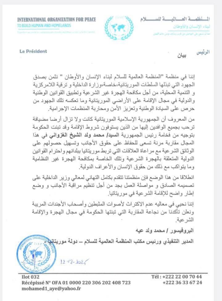 إننا في منظمة "المنظمة العالمية للسلام لبناء الإنسان والأوطان " نثمن بصدق الجهود التي تبذلها السلطات الموريتانية، خاصة، وزارة الداخلية وترقية اللامركزية والتنمية المحلية، من أجل مكافحة الهجرة غير الشرعية وتطبيق القوانين الوطنية والدولية في مجال الإقامة على الأراضي الموريتانية وما تعكسه تلك الجهود من حرص على السيادة الوطنية وتعزيز الأمن ومحاربة المنظم